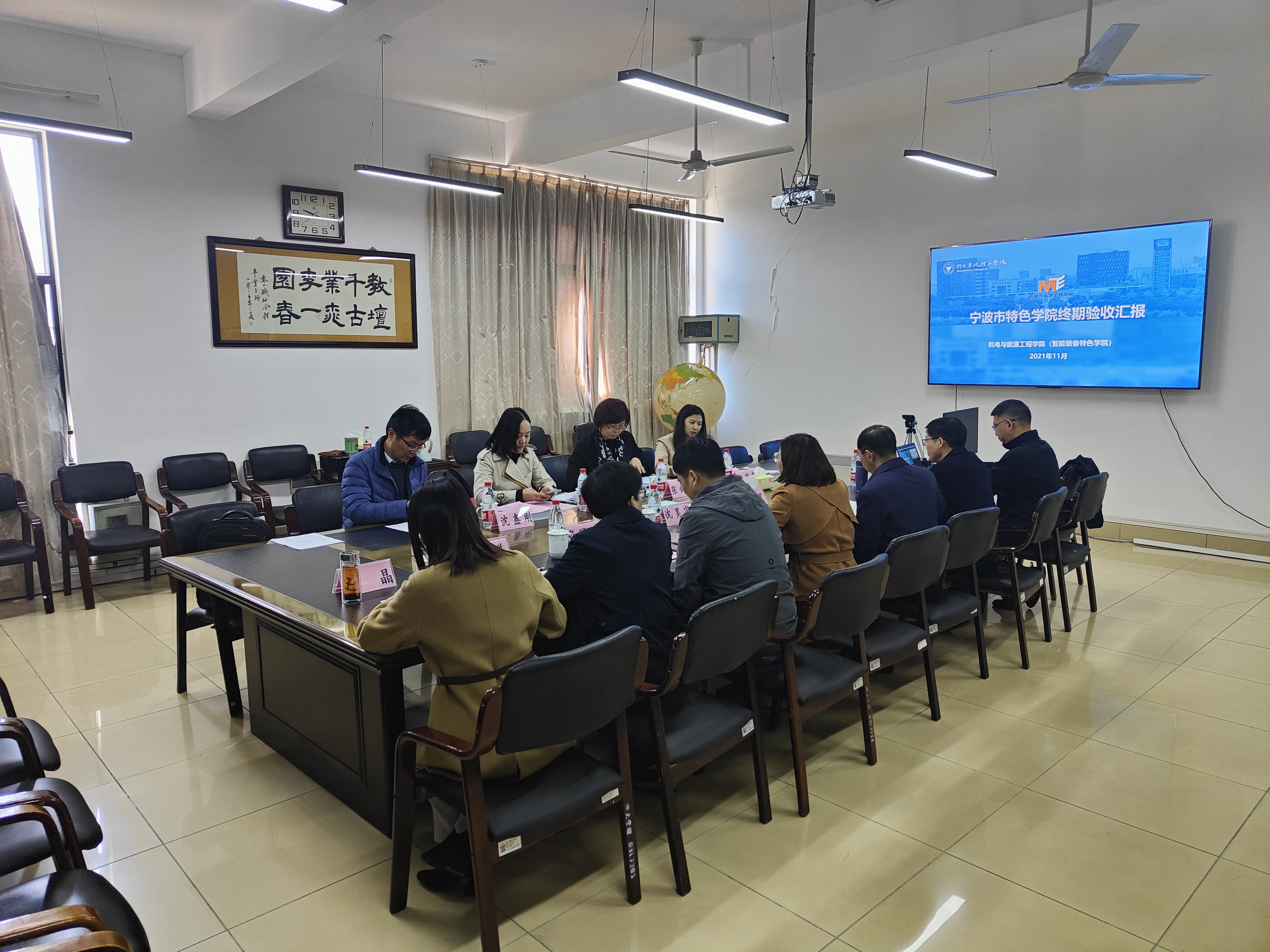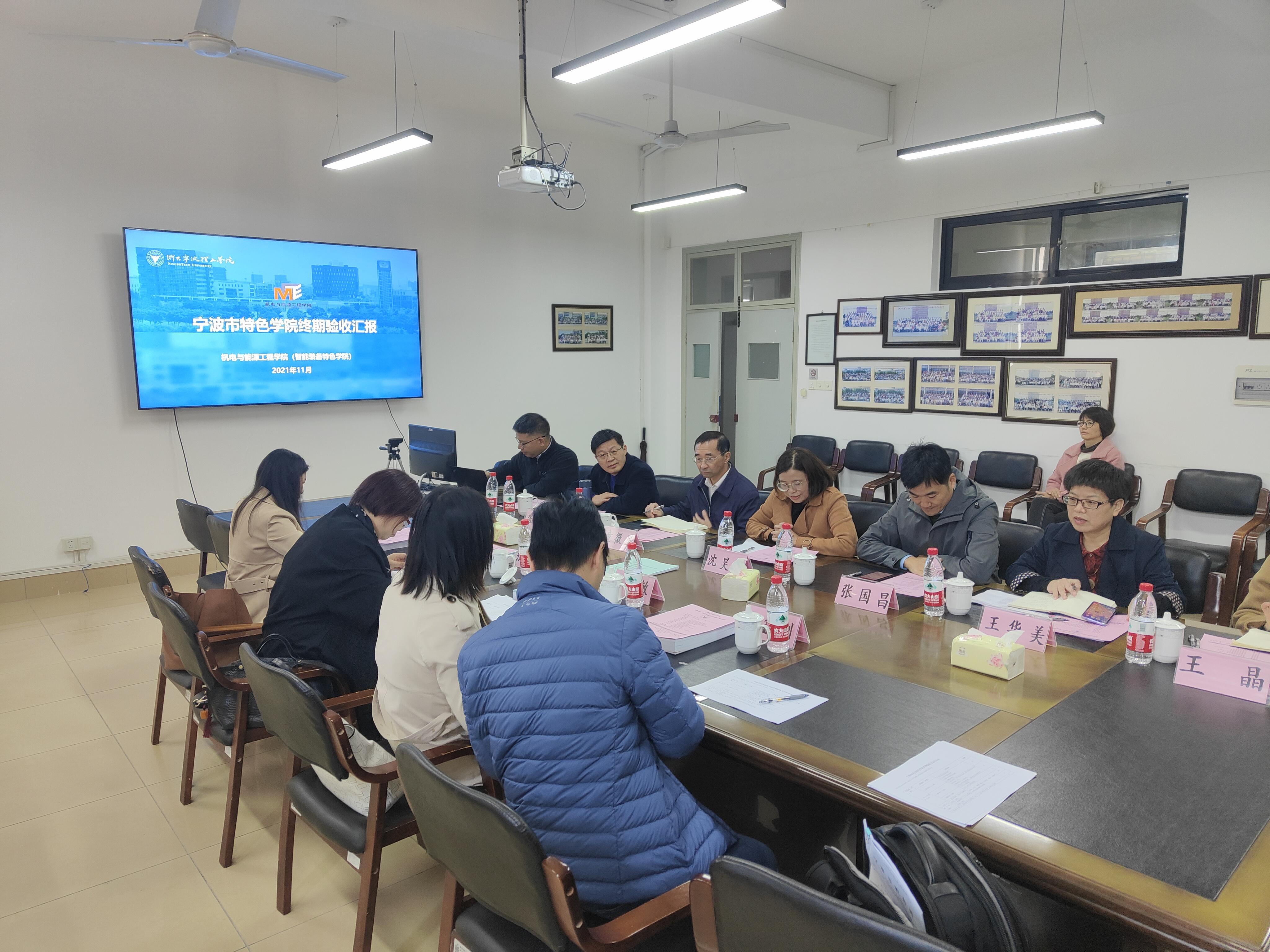 2021年11月9日,宁波市教育局高教处组织了宁波大学、浙江万里学院、宁波职业技术学院等单位的专家对机能学院承担的“智能装备特色学院”建设项目进行了验收。学校教务处处长沈昊宇,发展规划处副处长张国昌,计划财务处副处长王华美,机能学院党委书记童微星,党委副书记王晶,副院长胡长兴、张学昌及相关人员参加了本次验收会。