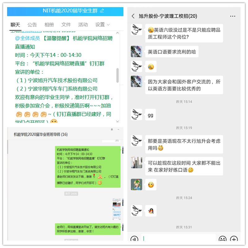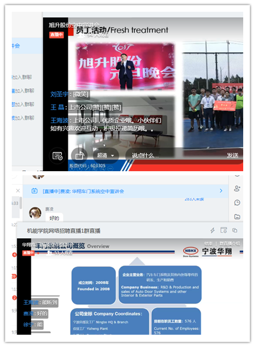 宣讲会邀请了宁波旭升汽车技术股份有限公司和宁波华翔汽车车门系统有限公司两家机械类企业客座直播间。两家企业先后从企业概况、岗位需求、员工发展、薪酬福利、工作生活环境等方面进行了介绍,同学们与两位招聘经理积极互动,有近20名学生加入企业二维码群,表达应聘意愿和咨询招聘情况。首场线上招聘宣介会同学们参与热情高,纷纷反映形式效果较好。