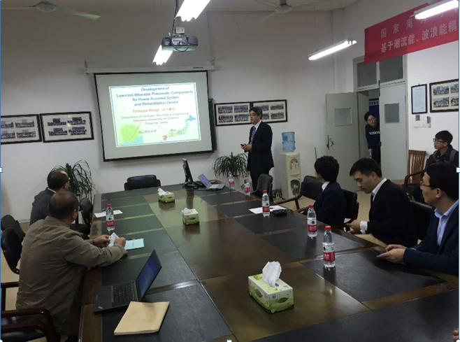 赤木彻也教授、小林亘助理教授、路波主任和黎鑫教授首先参观了国家海洋局新型海洋养殖装备研发与服务中心,黄方平副教授向访问嘉宾介绍了学院的发展情况,并对本校机械电子工程学科研究领域等方面的情况进行了交流讨论。随后,赤木彻也教授在机能学院会议室,做了《Development of Low-cost Wearable Pneumatic Components for Power Assisted System and Rehabilitation Device》的学术报告,并与机能学院部分师生针对低成本气动自动化元件的研发进行了交流和讨论。