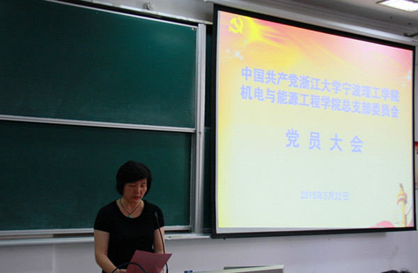 2015年5月22日下午,中国共产党浙江大学宁波理工学院机电与能源工程学院总支部委员会党员大会在SC115召开。校党委副书记陈小兰,机能学院院长王龙山、党总支书记吴春、副院长高德、王义强,学院各民主党派、教授代表以及师生党员代表等出席了会议。会议由总支组织委员胡鹿鸣支持。