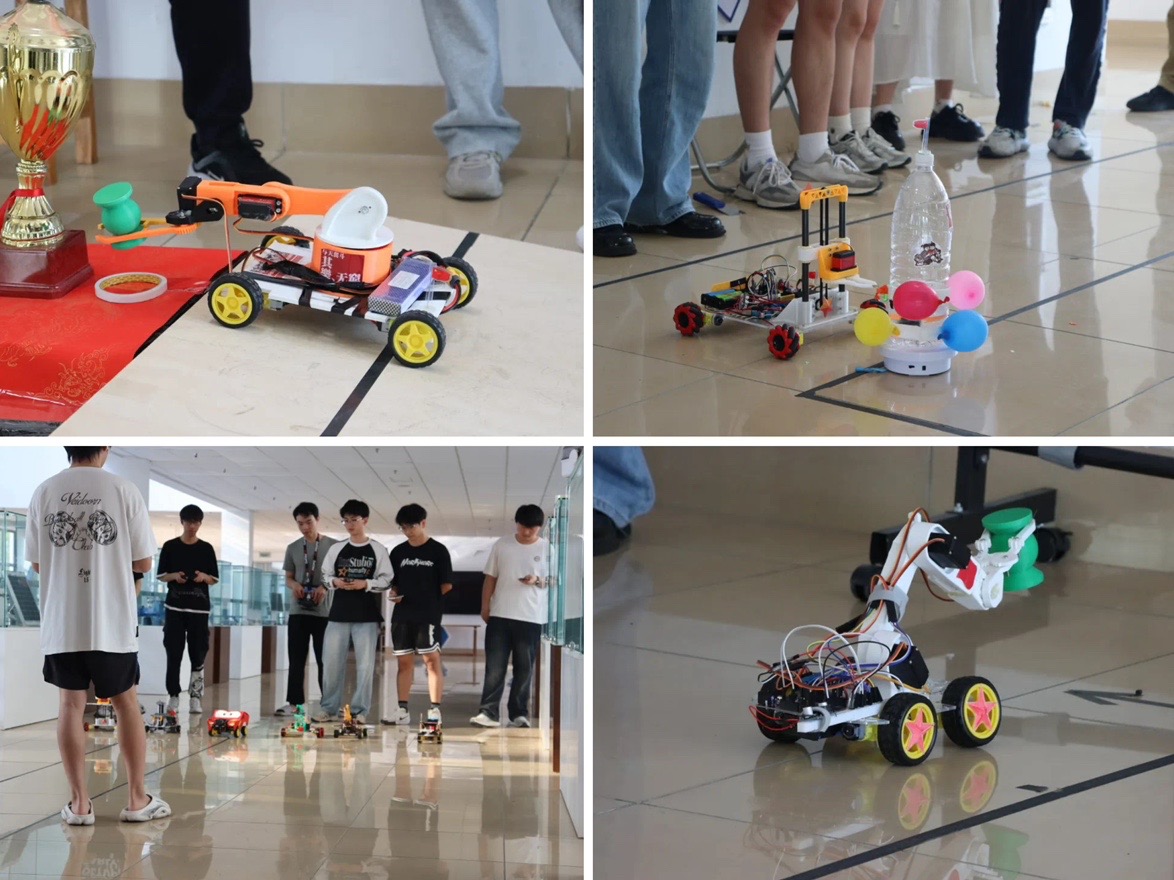 比赛现场,17支参赛队伍带着精心设计的机械小车精彩亮相。这些作品各具匠心:有的以精巧结构轻松完成搬运物块、扎破气球等高难度动作;有的凭借独特设计实现令人惊艳的炫酷功能;还有的以灵巧身形在狭窄空间自如穿梭。每辆小车都是创意与实用的完美结合,充分展现了参赛者的智慧结晶。