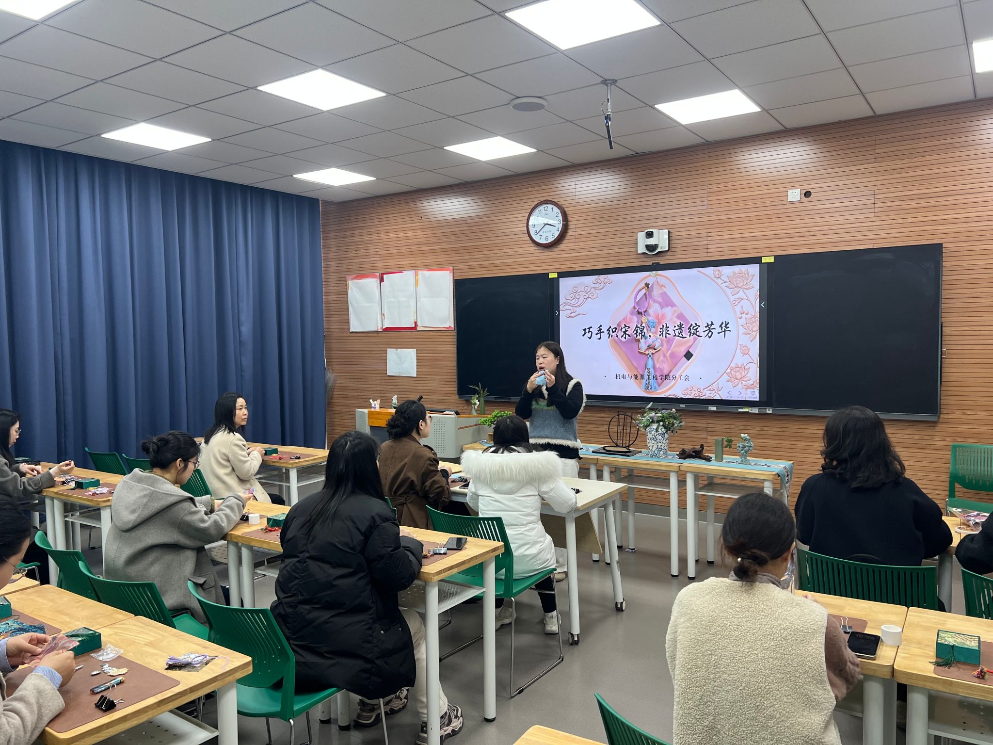 为丰富女教职工的精神文化生活,传承中华优秀传统文化,3月9日下午,机能学院分工会在NB120精心组织了一场“非遗宋锦挂件制作”主题活动。学院全体女教职工欢聚一堂,在指尖流转中感受千年宋锦的独特魅力,共度了一段温馨而富有文化气息的午后时光。